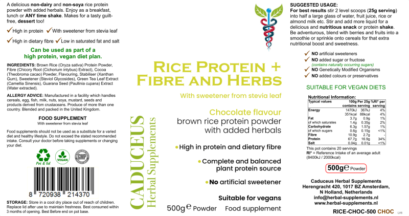 Rice Protein + Fibre and Herbs Chocoladesmaak) is een eiwitpoedermengsel dat het dagelijkse dieet van de gebruiker verbetert, met niet alleen een hoog gehalte aan complete en uitgebalanceerde plantaardige eiwitten, maar ook met voedingsvezels en kruiden.